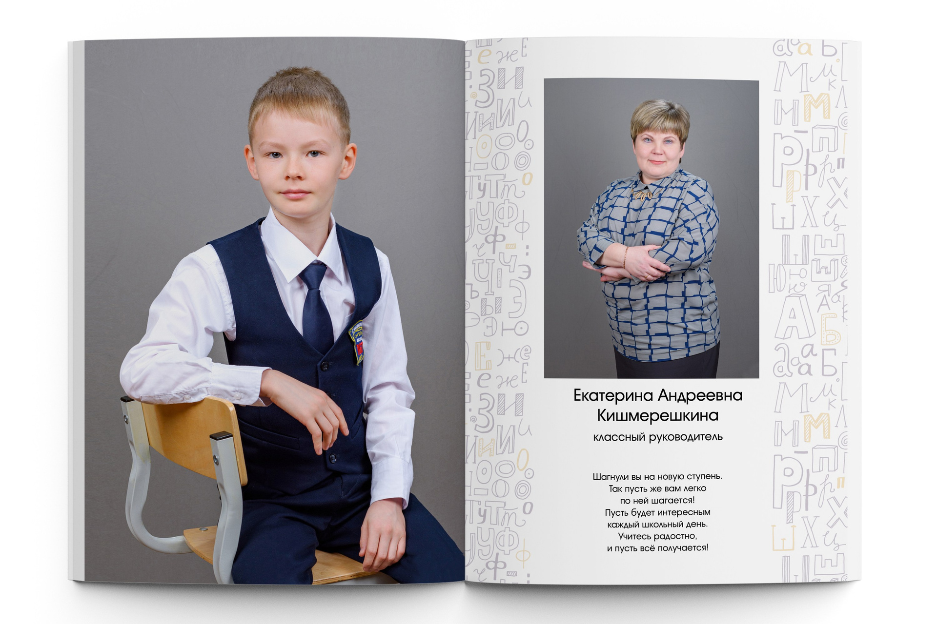 - Индивидуальная страница для каждого ученика; при желании ребята могут написать цитаты. Портреты детей располагаются все в алфавитном порядке.
